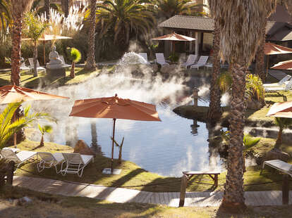 The rundown: Indian Springs is the country's oldest continuously running spa and pool facility, and was frequented by erstwhile Hollywood celebrities like Lucille Ball. Enter the long driveway dotted with palm and olive trees, and feel like you've stepped back in time. Since 1861, this place has offered a retro oasis in wine country, complete with 17 acres of hills and ponds. Grab a public bicycle on the bounds to get from your room to the pools, then strike up a game of cricket or shuffleboard by one of the fire pits. The Springs are located on four thermal geysers that supply the Olympic-sized swimming pool with its mineral water (temperatures reach 83 to 102 degrees) and features a poolside steam room. The resort is family-friendly, and so exist prepared for some (hopefully not super loud) children. You tin always escape to the smaller "Adult Pool" that'due south more than private, with non-mineral water that's nigh ten degrees cooler.